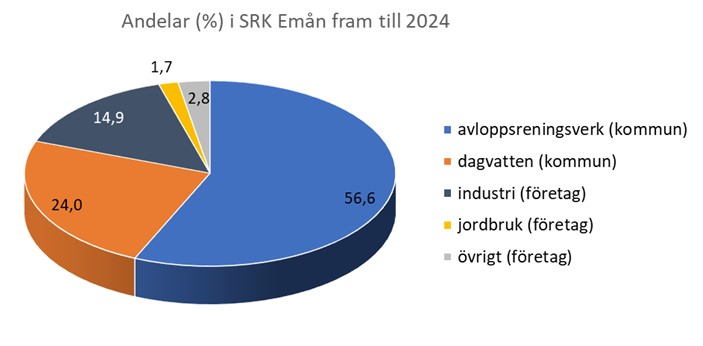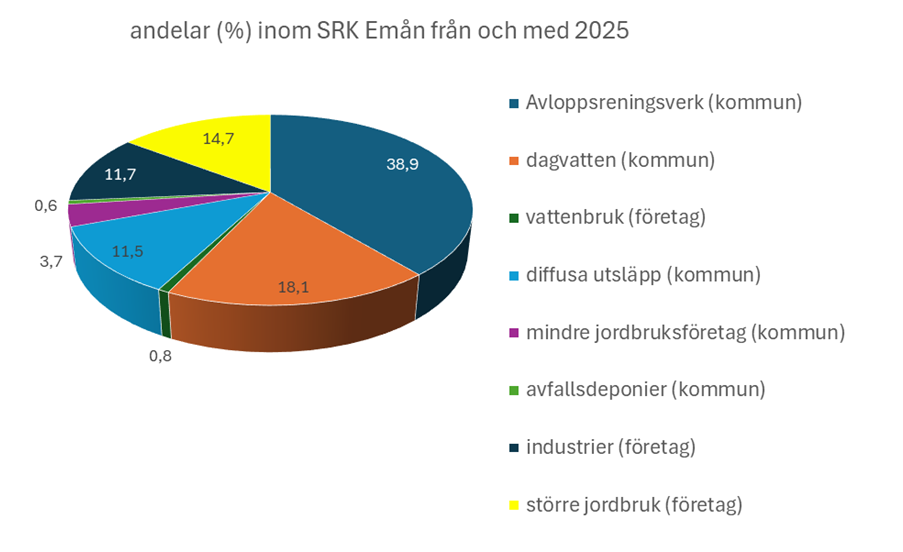 Kommuner och kommunala bolag ansvarar för avfallsedeponier, kommunala reningsverk, dagvattenutsläpp, mindre jordbruk (<100 djurenheter) samt diffusa utsläpp (enskilda avlopp och trakthyggesbruk). Industrier, större jordbruk (>100 djurenheter) samt förekommande vattenbruksföretag får däremot bära sina egna kostnader inom SRK Emån och har tilldelats egna andelstal per företag.